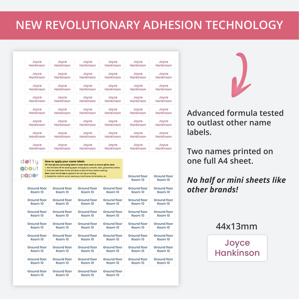 Our personalised labels for nursing home residents adhere to hard, flat surfaces with no mess and no fuss. They're dishwasher and steriliser safe, plus they won't fade or smudge. We offer a range of sizes and colours, all of which can be customised.