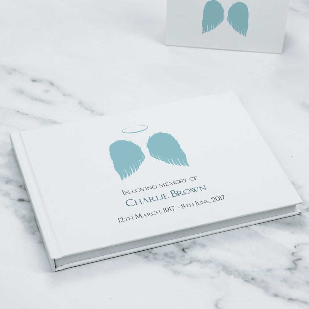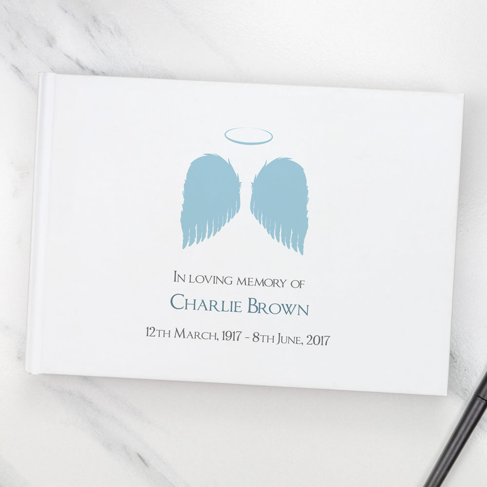 Personalise this guest book to create a lasting tribute to your loved one. The front cover features beautiful angel wings, while the back can be customised with a quote or other wording of your choice. Attendees at the funeral service can write their sympathies inside. Available in two size options, A5 or A4. You can change the wording.