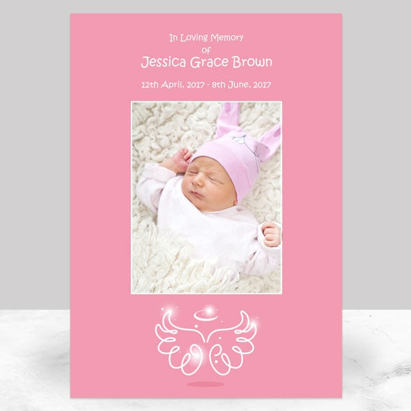 Angelic wings and a halo sparkle with heavenly light on this design, which is set against bright pink. Add a photo of your dear beloved one to the display sign and customise with a message of your choice. It can be displayed at a funeral or memorial service.