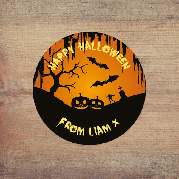 -Prepare some truly terrifying - and tasty - party favours for your trick-or-treat guests! This pack comes with sweet cone bags and ties, which you can fill up with spooky sweets The customised stickers show a personalised message of your choice for a unique touch The artwork depicts a zombie-infested graveyard under a full moon, with Jack-o'-Lantern pumpkins, bats, and tombstones joining the living dead Each pack contains: - 35 Personalised Stickers measuring 40mm in diameter - 35 Clear Sweet Cone Bags (bag only, no sweets included) - 35 Sweet Cone Ties (supplied in random s).