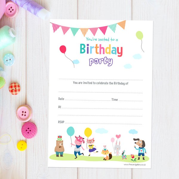 Get set for a party in the park with our cute animal friends! This birthday notelet for children shows lots of cute furry friends playing in the grass under a row of gingham and polka dot bunting There's a cute cow and cat, a funny fox, a bear bearing gifts, a delightful dog and duckling, and a bunny rabbit They have lots of balloons, too! At the top of the paper, bold bright text announces your child's party, while the space below can be used to write your own details.