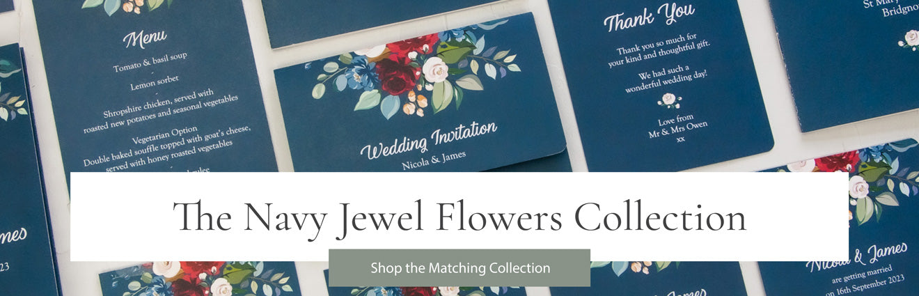 Send guests a fun poem card asking for a non-traditional wedding gift, like honeymoon or charity donations. Personalise these cute little postcards with your own verse or use one of our own custom poems. The dark navy blue design is ideal for a winter or autumn wedding theme. With rich jewel tones decorating the botanical bouquet, they are sure to impress your guests. Emerald green and ruby red make the roses and foliage stand out.