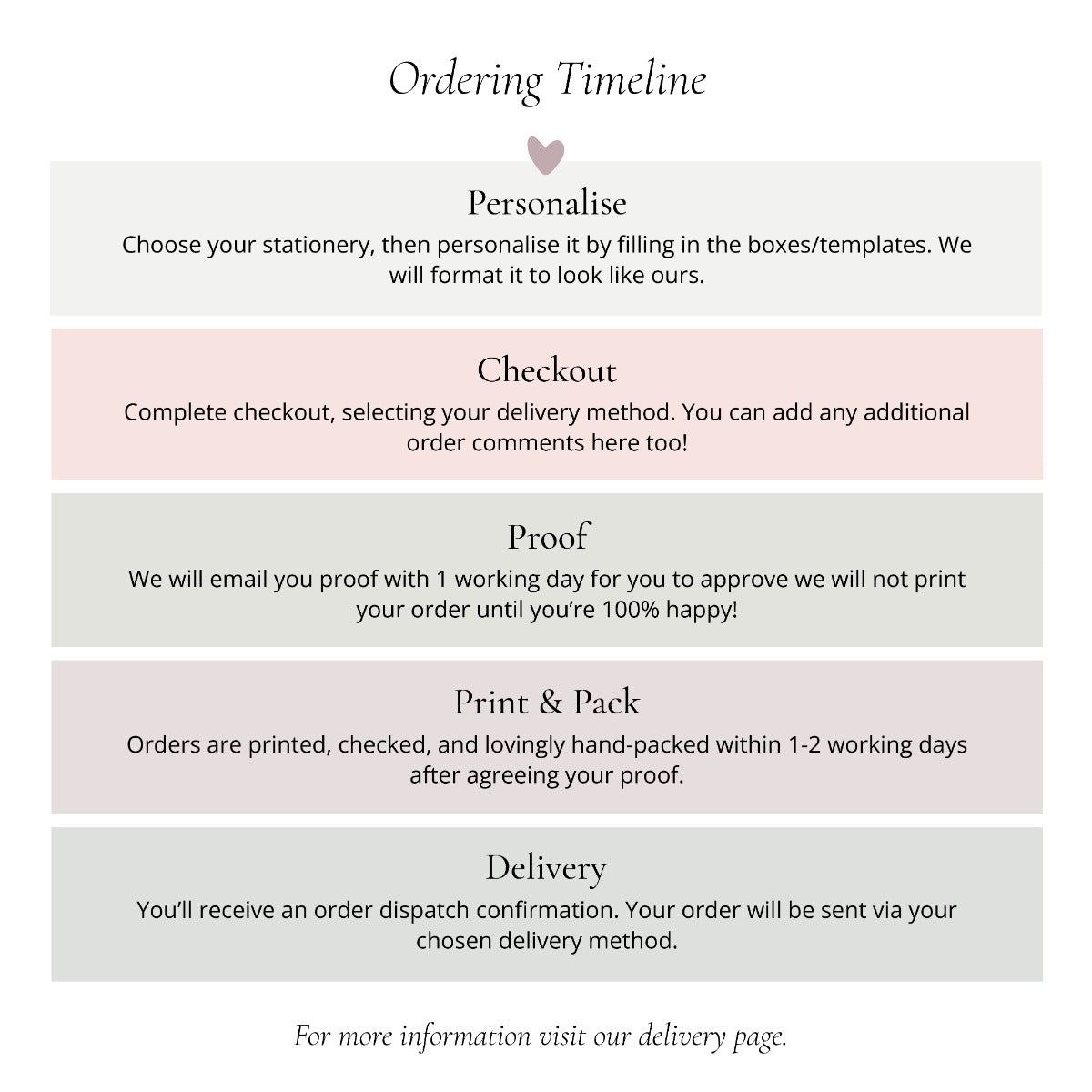 * Stationery products created using our online card designer will be sent to print when you place your order. On product pages where there are boxes to add your personalised wording, we will email you a proof before printing. This needs to be agreed before 12.30pm to be dispatched the same day.