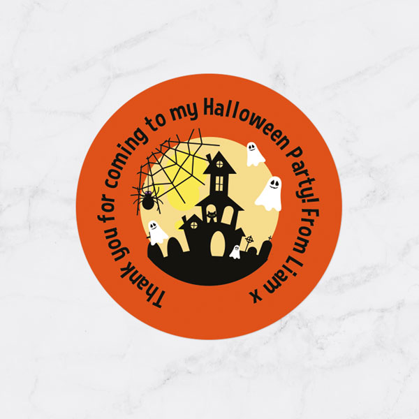 -Spiders and ghosts set the spooky scene on these round customised stickers A pumpkin-orange sky and moon create creepy vibes, and a haunted castle completes the terrifying tombstone maze! Personalise the message on the circular stickers to suit your own Halloween party Add them onto your sweet cones or party favours, or get creative in other ways to give your celebration some scary decoration! Each pack contains: - 35 Personalised Stickers measuring 40mm in diameter ,