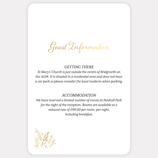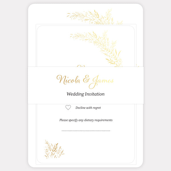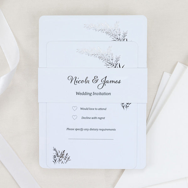 A floral scene is depicted in shining foil on these wedding invite suites. Delicate leaves and flowers set the tone for a botanical theme. Match these invites to your own wedding colour scheme with two elegant foil colours to choose from!
